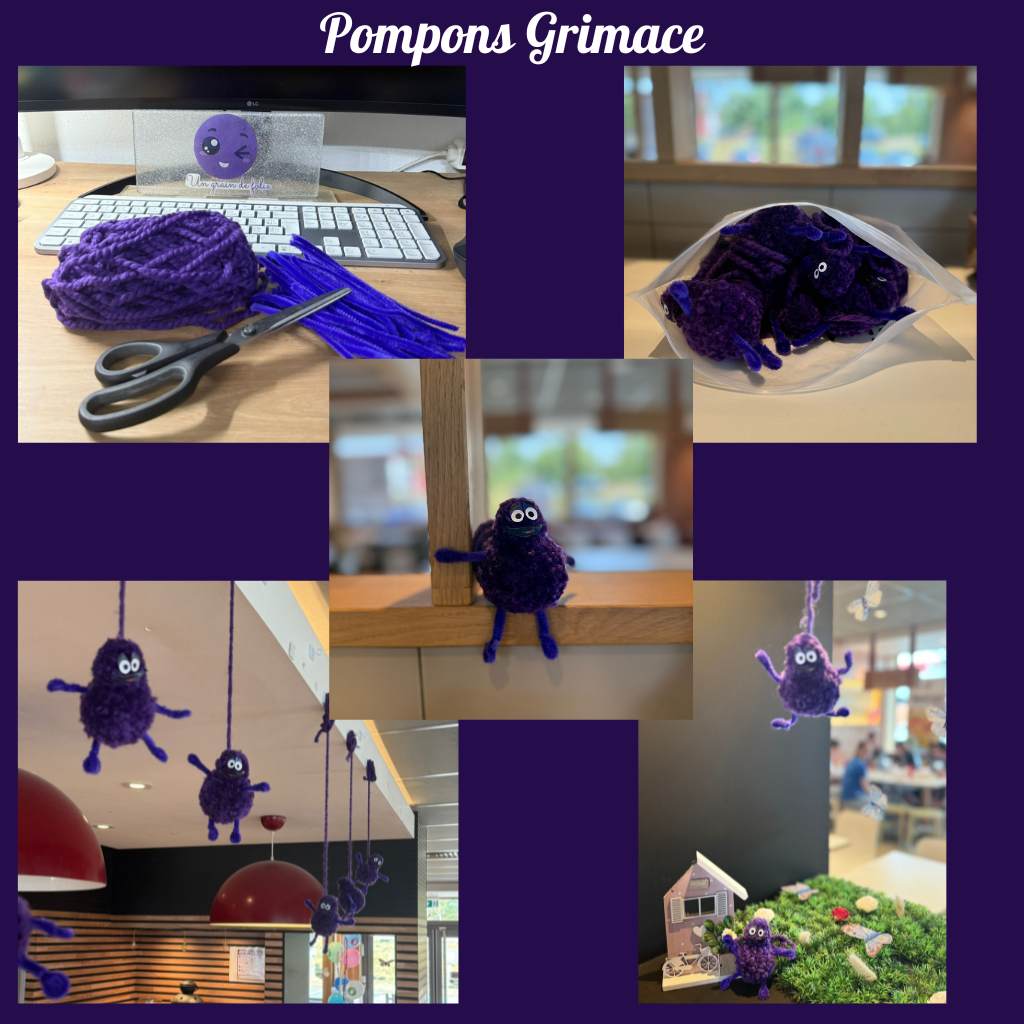 Lors d’un échange avec Gonzague, directeur du McDonald’s de Sablé-sur-Sarthe, l’idée des pompons Grimace a émergé naturellement. Un projet validé, réalisé et transformé en réalité… Parce qu’avec Un Grain de Folie, tout est possible!